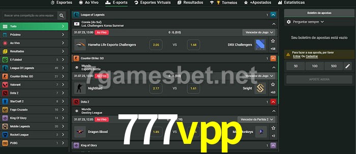 O 777vpp oferece uma grande seleção de opções de apostas em e-sports com probabilidades competitivas